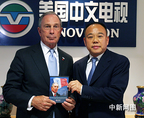 当地时间7月8日,纽约市长彭博走访了位于曼哈顿的美国中文电视总部。图为彭博(右)与美国中文电视总裁蒋天龙(左)。