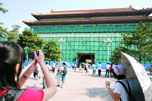 端门已经被脚手架围住。日前,位于天安门城楼北侧的故宫皇城大门端门开始修缮。据国家博物馆相关负责人介绍,修缮范围从天安门以北至午门以南,端门的城楼、城台将于8月中旬完工,端门至午门御道两侧的朝房以及阙左右门将于11月底完工。施工期间,端门城楼将暂时停止接待游客,穿越端门参观故宫不受影响。本报记者 浦峰 摄