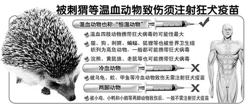 太原市防疫部门则表示,并不只是被狗咬伤后要注射狂犬疫苗,被温血动物咬伤后都要注射狂犬疫苗,刺猬当然也不例外。