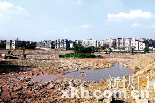 记者在西湾路原广州水泥厂旧址看到,该厂原来的大门门梁上挂着“广州旧水泥厂商贸城项目”等字样的横幅。原来的厂房如今已消失不见,取而代之的是一片洼地,几台推土机正在作业。