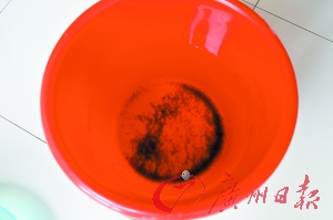 昨天上午,记者来到张女士的家里,她打开自来水龙头接了小半桶水,只见水里漂浮着不少黑色的细小物质。张女士说:“一个星期之前自来水就成这样了,我们只好把水放在桶里沉淀一会再用。”大约过了10分钟,水桶里那些漂浮的杂质沉在水桶底部,黑黑的一层,记者用手摸了一下,黑色的沉淀物呈湿黏状。张女士告诉记者,她怀疑是大楼的水池不干净引起的,这几天他们喝水都买桶装水。