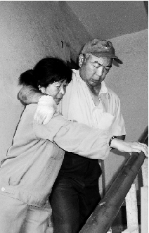 刘惠珠尝试着让丈夫学上下楼梯,她弯下腰充当丈夫的“拐杖”,每下一个台阶,她都要蹲下身子搬着丈夫的脚向下挪,常常累得直不起腰。