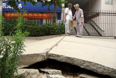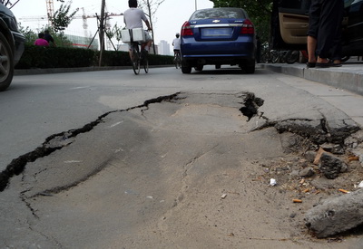 “都塌了有一个多月了,一直没人来修。”路口附近一处停车场的收费员说,塌陷处以前地势就比较低,经常积水,后来一辆小轿车倒车时正好碾过,路面当时就塌了。“开始时坑没这么大,后来经常被汽车碾轧,坑就越来越大了。”收费员说。
