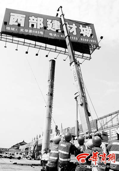 昨日上午7时,西安市未央区城管执法局出动70名执法人员、1台大型吊车,对位于太华路中段的一个面积达200多平方米的巨型单立柱广告进行强拆。专业拆迁人员系上安全绳后爬上立柱,用切割机切断固定广告牌的钢筋后,再用吊车将其从顶部吊下来。上午10时许,吊车吊着广告牌从高空徐徐落下。