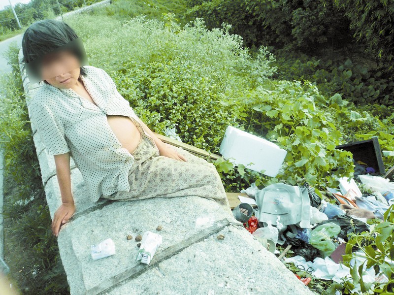 这名孕妇一直坐着,当记者问她话时,她目光茫然,神情哀伤,偶尔动动嘴巴却说不清什么。许多苍蝇在孕妇身边飞来飞去,还有一些黑蚂蚁在咬她,孕妇不时发出“哧”的叫声。
