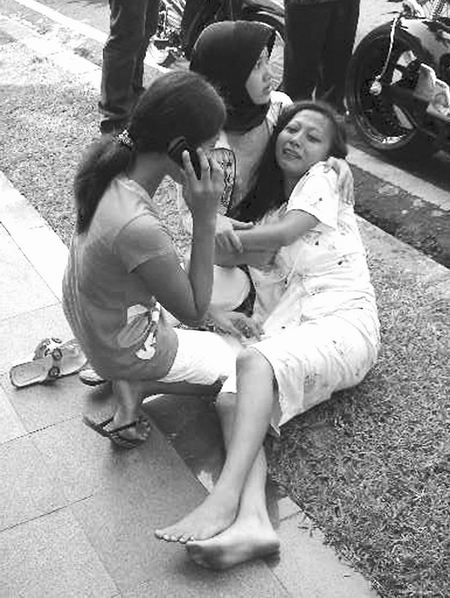 7月17日,在丽思卡尔顿酒店前,一名妇女在爆炸中受伤。