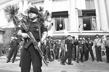 7月17日,印度尼西亚特警在发生爆炸的丽思卡尔顿酒店外警戒。 新华/法新