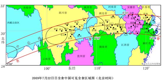 2009年7月22日上午8 时左右,将发生一次历史罕见的日全食。据中国国家天文台预报称,此次全食带从不丹进入我国境内。我国可观测到这次日全食的地区包括西藏东南部、云南西北部、四川、重庆、湖北、湖南北部、安徽、江西北部、江苏南部、浙江北部和上海等11个省份。其中,武汉、铜陵、桐城、湖州、常州、无锡、苏州、杭州、嘉兴、绍兴、上海、宁波、舟山13个城市位于日食带内,适宜进行日全食观测。全国其他区域也均能看到日偏食。