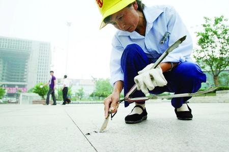 20日,在潍坊市火车站广场上 ,保洁员孙女士正在奋力地用小铲子铲除黏在地面上的口香糖。孙女士说,不少人将口香糖随地乱吐,时间一长就如同长在广场上的黑斑,十分难看,“光我负责的那近百平方米,一下午就能铲除百余个口香糖。”