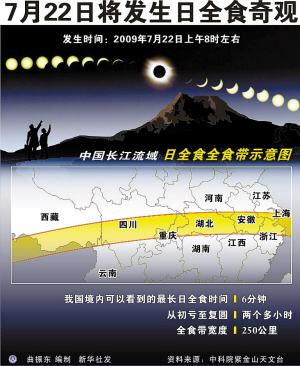 本报综合报道 22日上午8时许,我国将出现500年一遇的大日食奇观,日全食持续时间最长可超过6分钟。这次日全食发生在我国人口十分密集的长江流域,全食带覆盖人口将达到3亿,在我国史无前例。