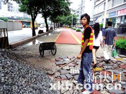 中山大道一人行道工地的负责人告诉记者,这种透水材料是上级单位要求使用的,由于近期广州人行道改造的工作量非常大,供货经常不足。“前个星期休息五天,老是没材料。”现场一位工人说。
