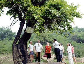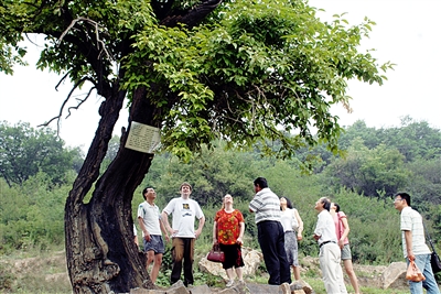 图:当地尚存一棵600余年的翅果油树,遭多次雷击,树干已经碳化依然开花结果。