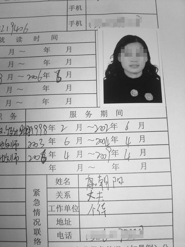 据优佳丽公司一负责人介绍,他们招陈雪娥进公司时,并不知道她丈夫的特殊身份,因为当初,陈雪娥在应聘资料上填写丈夫的身份是开五金店的个体户(如图)。