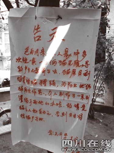 “为防止此两猫再次作恶,本人制作了一系列置猫于死地的办法,故请猫主人好自为之,否则不日将挂猫尸于此。”最近几日,一张看起来有点“触目惊心”的告示,出现在成都青羊东一路68号大院里,引起居民议论纷纷。而张贴此告示的是居住在该院的一宋姓小伙儿。他说,两个月来,家中常被两只猫光顾,糟蹋东西不说,还在屋里拉屎拉尿,不堪猫扰,才出此下策。