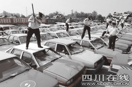 本报讯(记者王伟摄影陈羽啸实习生涂岱彬)昨日,156台非法营运车辆在成都龙泉驿区西河镇进行集中销毁,其中包括90台仿冒出租车和66台逾期未接受处理的非法营运车辆。成都市交委行政执法总队相关负责人说,这是今年销毁非法营运车辆数量较多的一次。