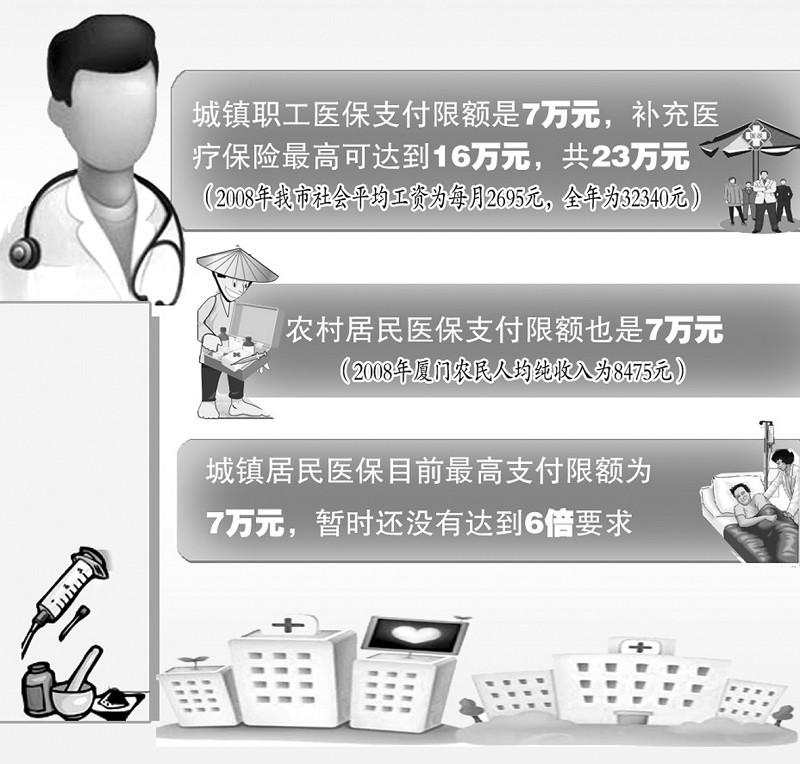 据悉,目前厦门市城镇职工医保支付限额是7万元,补充医疗保险最高可达到16万元,加起来总共23万元,远远超过了收入6倍的标准(2008年我市社会平均工资为每月2695元,全年为32340元)。农村居民医保支付限额也是7万元,已超出农民人均纯收入6倍左右的要求 (2008年,厦门农民人均纯收入为8475元)。而厦门市城镇居民医保目前最高支付限额为7万,暂时还没有达到6倍要求。