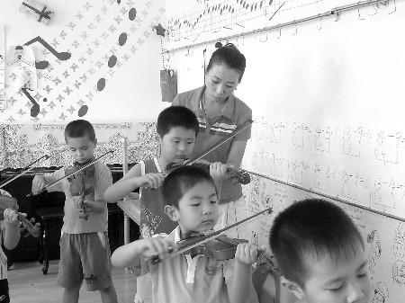 在市区一家幼儿园里,幼儿教师在指导孩子们拉小提琴。