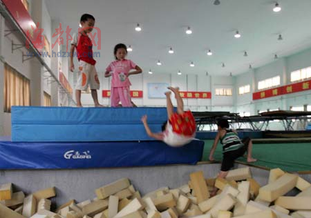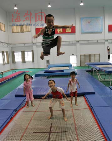 蹦床的弹簧声,孩子的欢笑声,教练打拍子的掌声……昨日,福州市体育学校的蹦床馆内,到处都闪动着孩子们的身影。二十多名上小学的孩子,并没有像其他孩子那样,在暑假享受着冷饮和电脑游戏,而是在蹦床馆里挥洒着汗水,在跃动的蹦床上飞舞出属于自己的精彩。