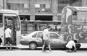 昨日12时许,沈阳市大东区小津桥交通岗附近,两辆218路公交车将中国人民财产保险股份有限公司的查勘车夹在中间。驾驶人保财险查勘车的查勘员表示:“这车被撞成这样,最少要2万块钱才能修好。”