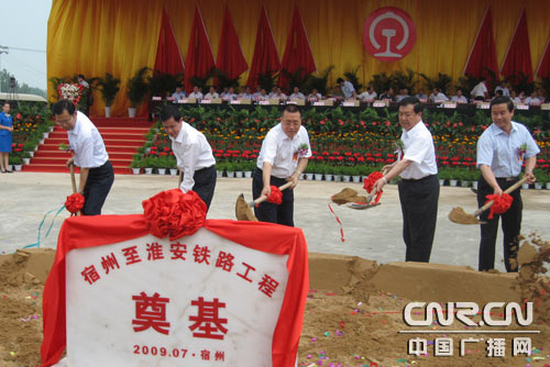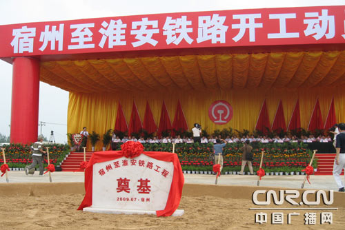 中广网合肥7月29日消息(记者张秋实)今天上午,宿淮铁路开工建设动员大会在安徽省宿州市举行,该铁路的开工建设对加强皖苏两省交通联系,推动两省经济发展具有重要作用。铁道部和安徽、江苏两省领导参加动员大会,并为工程奠基。