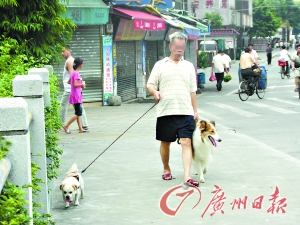 记者昨日在周门北路看到,一位阿伯正左手牵着一只牧羊犬,右手牵着一只北京犬散步,两条狗的脖子上都没有挂狗牌。一名环卫工人说:“每天早上我都要扫一大堆狗粪,有些就直接排在路中间。”