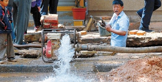 工作人员排水抢修水管(资料图)记者 黄雪飞 摄