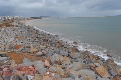 这个抢救性工程,是指修建那条被冲垮的海堤。被冲垮的海堤是直墙式的,造价低,但留不住沙子,石狮的黄金海岸也采用这种海堤。重新修建的海堤,采用斜坡式,有利于留沙,还有采取一些消浪的工程技术,分散浪的冲力,尽可能留住海浪带来的沙子。该方案由省水利水电勘测设计研究院制作,已通过论证。“县领导的决心很大,只要有利于固沙,造价再高也要做。”据悉,这个海堤修建工程的最新概算投资为1000多万元。