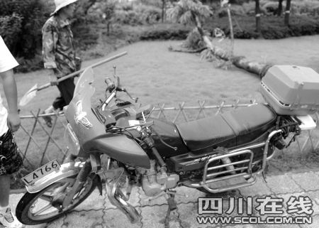 出事后的现场一片狼藉,只见直径约15cm、长六七米的行道树挣脱3根支撑它的小棍子,连根拔起,倒地后树干端端压在一辆车牌号为L4766的红色摩托车身上,车子已被压变形,后灯还在闪。车前的行李篮子掉落在地上,还有两把伞、一件雨衣、一个头盔、一副眼镜和一摊血迹。