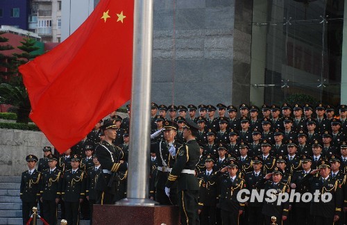 中国人民解放军驻澳门部队八月一日举行升国旗仪式及庆祝酒会,纪念建军八十二周年暨进驻澳门十周年。图为驻澳门部队一日早晨在驻军大厦前举行升国旗仪式。中新社发毕永光 摄版权声明:凡注有“cnsphoto”字样的图片版权均属中国新闻网,未经书面授权,不得转载使用。【更多图片】
