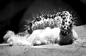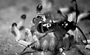 黄色的幼虫成群从毛虫身体里出来,场面相当骇人。这个过程中,毛虫的身体一下子瘦小了很多。爬到空气中后,寄生蜂幼虫开始吐丝结茧。具有讽刺性的是,此时寄生蜂最大的危险是被其他寄生蜂寄生。不可思议的是,受伤的毛虫并没有死,它就像《魔鬼终结者2》里的T800号机器人一样带伤保护自己的“主人”。通常毛虫会为自己结茧,但被寄生蜂寄生的毛虫会在寄生蜂幼虫的茧上吐丝,给它们加上一个保护层。科学家们认为寄生蜂布下的病毒现在已经侵入毛虫的大脑,让它做出如此古怪的行为。毛虫与生俱来的自我保护行为也被寄生蜂利用,它撕咬扑打其他的寄生蜂,让它们远离菜蝶绒茧蜂的蛹。它不知疲倦地保护寄生蜂的蛹,直到自己饿死。几天后,漂亮的菜蝶绒茧蜂成虫从蛹中爬出,继续险恶而又美妙的生命缩环。