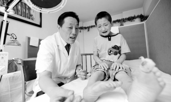 当看到来自朝阳农村的杜亮家贫如洗,诊所不仅免除治疗费用,还给杜亮租了房,为他们做一日三餐。经过20余天的针灸治疗,小伟有了可喜的变化,脸上可见细微的汗水,脚也有了疼痛知觉。8月3日10时40分,记者看到尽管小伟在做针灸时手上扎满了针,但他没有一点疼痛的感觉,反而不时动手去触摸钢针。但当王剑拿起针准备给小伟脚心做针灸时,小伟的脸上就流露出恐慌神情。针刚扎到脚心,小伟就嚎啕大哭,“求求你,别扎了,疼,疼。”