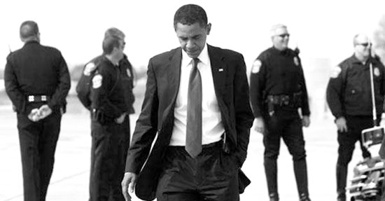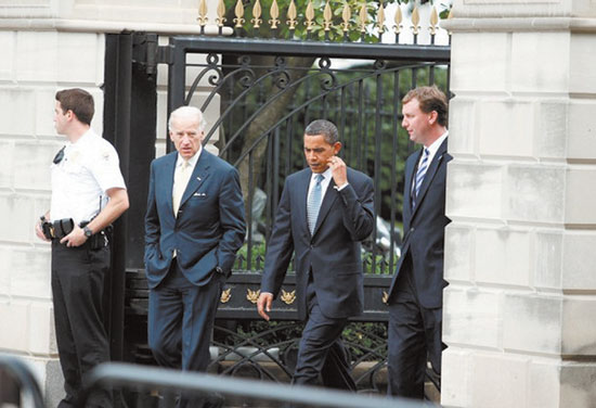 奥巴马(右二)满脸愁容步出白宫。