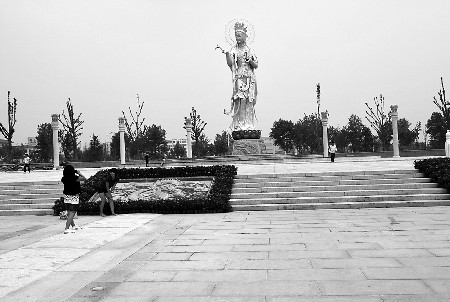 游客在礼佛大道的菩萨广场前照相留念。