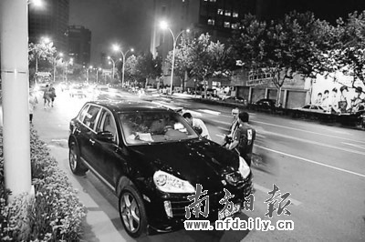4日晚上10时,记者赶到事故现场。在事发现场,黑色的保时捷卡宴停在斑马线北边1米处的机动车道上。广电集团的保安单师傅说,他在当晚9时20分听到刹车声跑出来。被撞者是名年轻女孩,当时和小姐妹一起,从东往西过马路。“砰一声巨响,女孩被撞飞了二三十米远,地上还有一大摊血。”广电集团职工刘小姐当晚加班,身在14楼,她还是听到了撞人那一刹那的巨响,赶紧跑了下来。