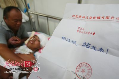 8月6日下午,吴燕平委托员工赶到医大三院,将5000元现金送到杨立坡母亲手中,还打印出一句鼓励的话“杨立坡,站起来”。