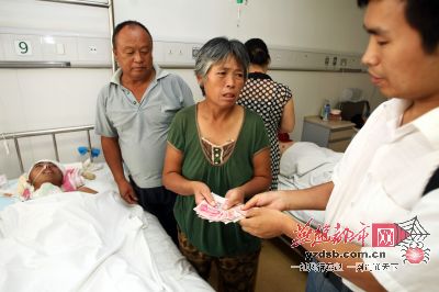 记者将捐款交给杨立波的母亲