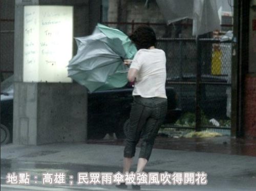 高雄,民众雨伞被强风吹得开花。来源:台湾《联合报》