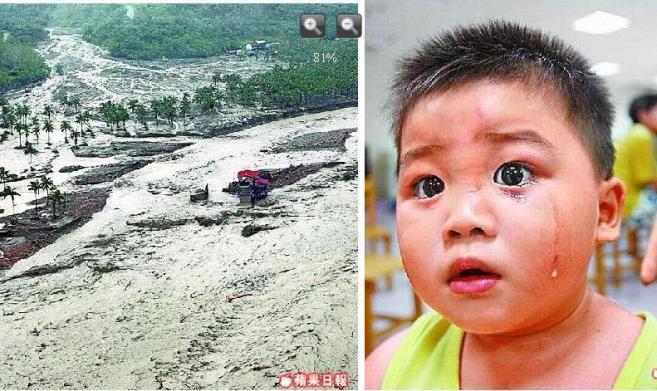 惨!小林村没了,恐埋600人(左);小林村男童获救后,因想念未脱困的父母,不断落泪(右)。
