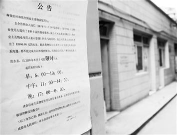 在成都市成华区文德路祥和苑小区内,一张近日张贴的限时供水通知使得居民议论纷纷。面对业主的强烈抗议,昨(10)日,小区物管部门负责人表示,由于地下管网破损、水表严重老化,祥和苑物管方每月代收的水费与实际上交的水费存在1万元以上的差额,为此两年内该小区物管公司已经换了3家。而实行限时供水只是为了减小水费差额,纯属无奈之举。