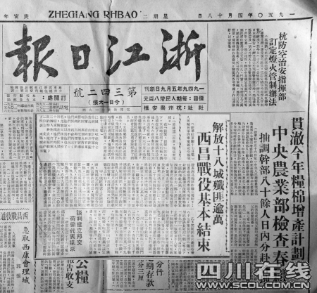 当天,中共西昌市委党史研究室主任还将“镇室之宝”给记者看。这是一份发黄的《浙江日报》,发行日期为1950年4月18日,报纸的边角已经破损,字迹有些模糊。报纸右下角醒目位置一篇名为《西昌战役基本结束》的希望这样写到:1950年4月8日,西昌战役胜利后的第二天,中国人民解放军、西南军区司令员贺龙,政治委员邓小平向毛泽东主席、朱德总司令报告了西昌战役胜利的消息。接着周恩来总理在全国政治协商会议上庄严宣布:“经过西南、滇西、西昌战役,解放了除西藏以外的大陆领土。”西昌战役成为新中国进入新时期的重要标志。这是中共西昌党史研究室保存下来关于西昌解放最早的报道。