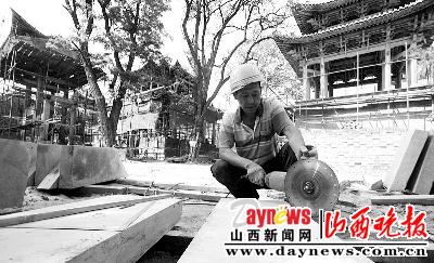 昨日,迎泽公园晋商会馆建设工地上的工人们正在加紧施工。晋商会馆是今年省城的重点工程之一,是弘扬中国传统文化,展示晋商创业精神的一项大型公益性工程,总投资6000多万元,总建设面积达3600平方米。目前,工程正按施工进度进行着,预计将于12月底前完成主体建设,明年5月1日前完成工程设备安装及其他配套工程项目。