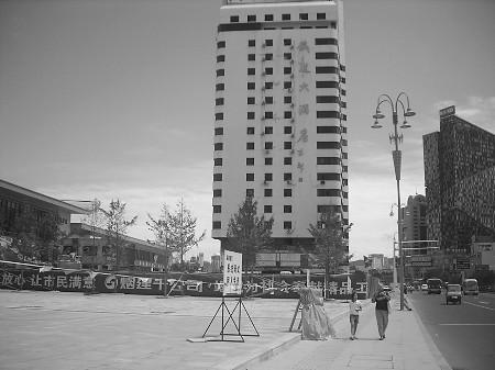 在这座东西宽达几百米的新站南侧,一栋十几层的土黄色铁道大厦沿街矗立,这栋建筑底层的许多墙皮已经剥落,露出了大片的石灰和方砖。一楼一处内凹的位置竟成了一个不大的自行车棚,不时有大厦的工作人员前来停放自行车。 在大厦的西侧,一间几平米的小屋歪歪斜斜地站着,牌子上写着“铁道大厦平价宾馆”。这一大一小两栋建筑就挡在新站前方,从街对面望去,显得十分不协调,无怪乎有的市民称新站的前方留了两块补丁。