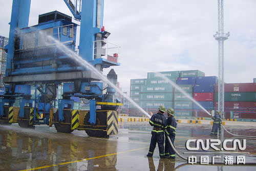中广网宁波8月12日消息(记者曹美丽 通讯员陈宏舟 孔金荣)8月11日上午,宁波港公安局北仑港区消防中队举行了一场针对港口大型机械设备发生火灾的消防演习。