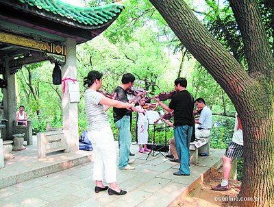 自2000年5月1日湖南烈士公园免费开放以来,到今年6月1日,长沙绝大部分公园景区都实行了免费对市民开放。这些免费开放的公园景区,成了市民们自己的“后花园”。每天,到公园景区里锻炼、游乐的市民络绎不绝。这是在湖南烈士公园,一群市民正在自娱自乐。星辰在线网友竹子摄
