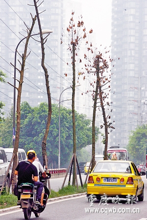 栽在南坪南湖大道马路中间的树木部分已经枯死 记者 钱波 摄