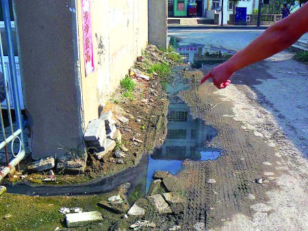 记者在现场发现,乙炔厂对面的塑钢窗厂门口堆积了一摊已变绿的死水,据一位工作人员介绍,”这片平房地势低洼,每逢下雨都会淤积很多雨水,由于现在下水道堵塞,雨大的时候生活垃圾被从下水道里冲出来,有时候垃圾会冲到马路上,雨过后我们再打扫,我们多次向房东反映都没结果。