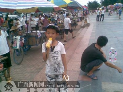 戴着太阳能风扇遮阳帽在烈日下吃玉米的小朋友。广西新闻网实习生 王菲菲。