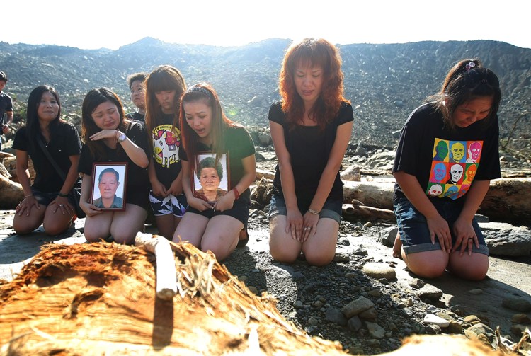 莫拉克台风带来豪雨造成88水灾,高雄县甲仙乡小林村罹难者家属,15日在头七回到灾害现场招魂,家属抱着遗照,哭喊亲人的名字。
