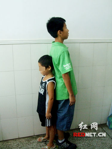 曾龙宇来自湘西凤凰,已经小学六年级的他和旁边一位11岁儿童站在一起,足足矮了一大截,让他自卑不已。他告诉记者:“平时在教室我都做第一排,坐公交车也不用买票,可是我不喜欢这样,感觉有点自卑。”