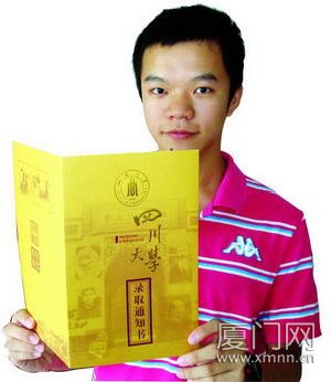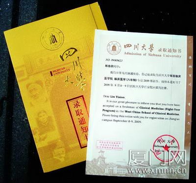 四川大学的录取通知书封套是明黄色的,烫金字体,充满历史感。厦门外国语学校毕业生林逸骁被川大华西医科录取,他毫不掩饰自己对这份录取通知书的喜爱:“看到的第一眼就觉得喜悦啊,激动啊。本来想说会不会是红色的,后来打开一看是金黄色的,觉得很别致。再想想,很有道理啊,金榜题名嘛。学校我很喜欢,专业也很理想。”